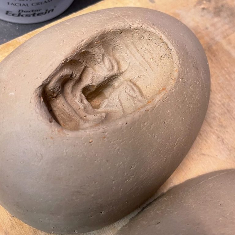 Prozess: Inlay-Technik. Federahannes-Motiv in die Negativform eingelegt und unter Druck mit Ton überpresst.