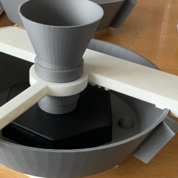 Prozess: CAD-Entwicklung und iterativer Druck eines mehrteiligen Systems. Es umfasst eine komplexe Zentrierungs- und Trägerstruktur für den Guss sowie Beschriftung der Gipsform mit Name, Version und Schlicker-Füllmenge.
