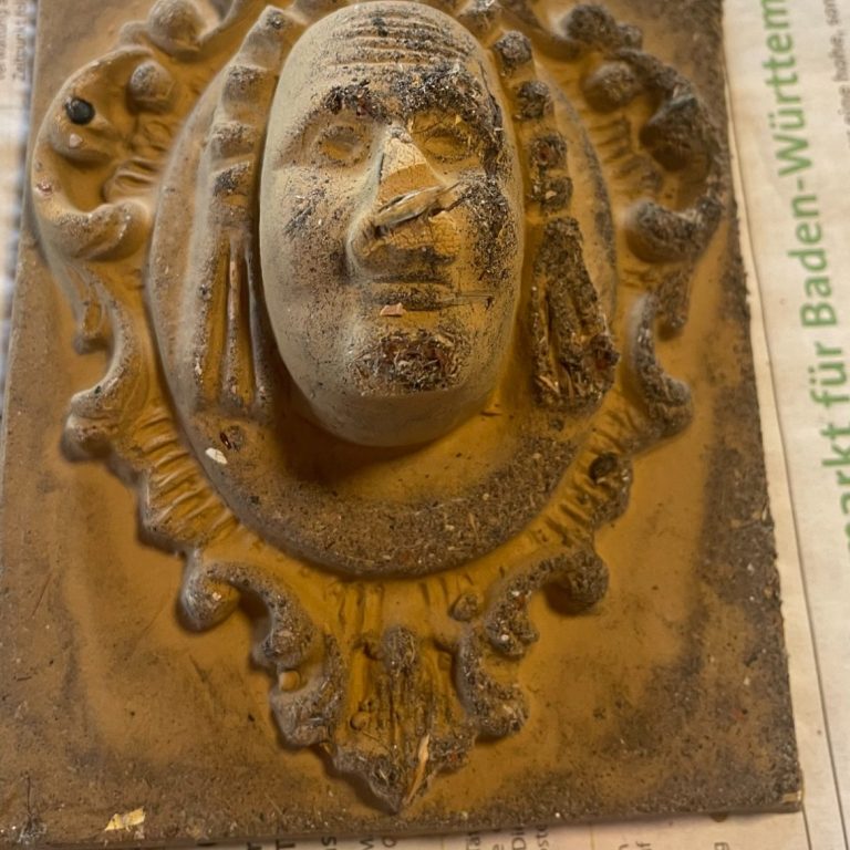 Material: roter, fein schamotiertter Ton und jahrzehnte alter Oberflächenschmutz aus dem ältesten Haus im Dorf.