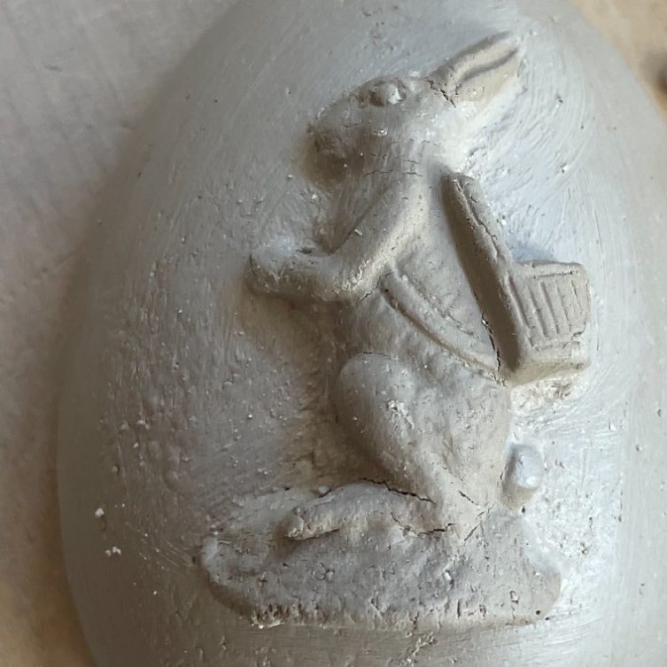 Prozess: Traditioneller Aufbau. Applikation des historischen Hasenmotivs im lederharten Zustand. Ei in Gipsform gepresst.